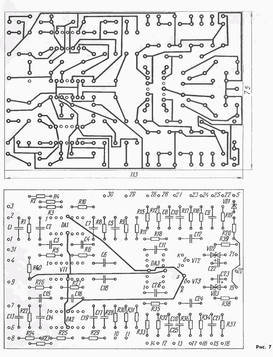 Оба канала устройства собраны на печатной плате из стеклотекстолита. Рисунок печатных дорожек показан на рис. 7, а, а расположение деталей — на рис. 7, 6.