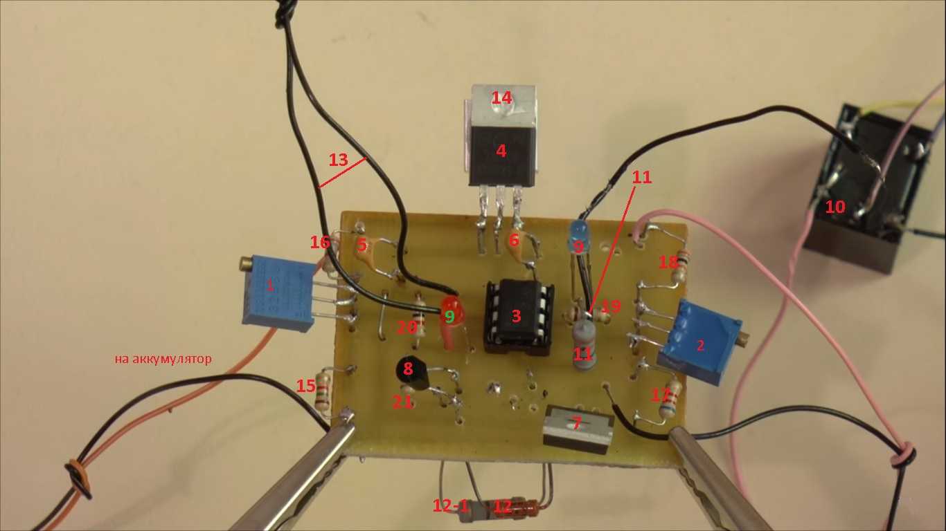 - При разрядке аккумулятора до нижнего предела, выставленного в подстроечном резисторе (1), автоматически включается зарядка.