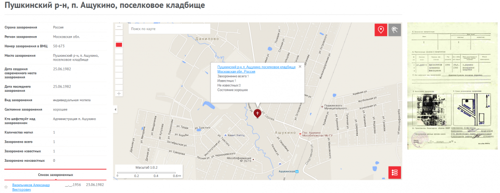 Страница о захоронении содержит информацию о его состоянии (хорошее, плохое, отличное), вид захоронения, количество могил, количество известных и не известных захороненных. Также на странице доступен список захороненных с именами и датами рождения и смерти.