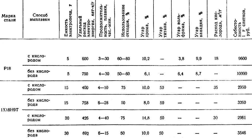 Средняя продолжительность плавок легированных сталей при выплавке на свежей шихте с рудным кипом без применения кислорода составляет 5 час. — 6 час. 30 мин.; удельный расход электроэнергии при этом 750-850 квт-ч/т.