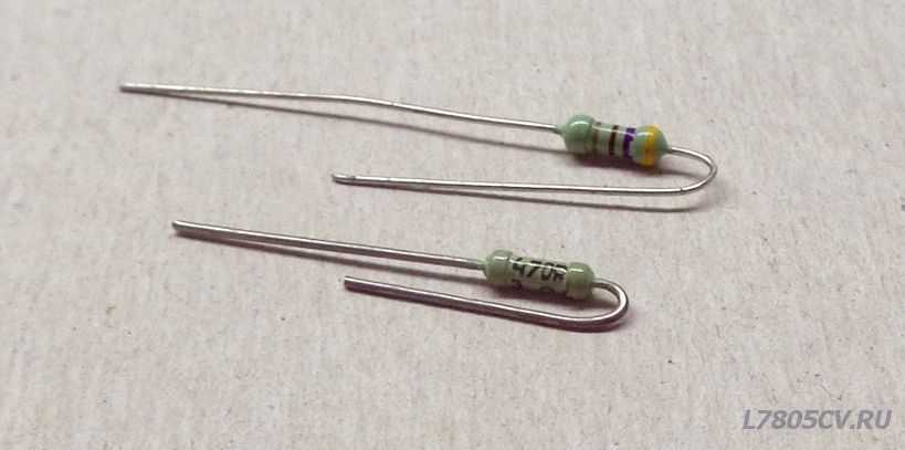 Резисторы с одинаковым номинальным сопротивлением 470 Ом, но с различными типам маркировки: текстовой снизу и цветовой сверху