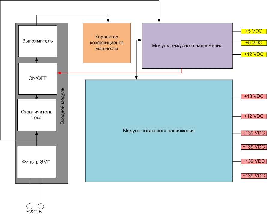 - Входной модуль. Его задача – подготовить напряжение для питания остальных узлов. Входная часть может содержать фильтр электромагнитных помех, ограничитель тока, коммутатор питания (работает по сигналу из модуля дежурного напряжения и подает питание на основные блоки), а также выпрямитель, питающий импульсные преобразователи.