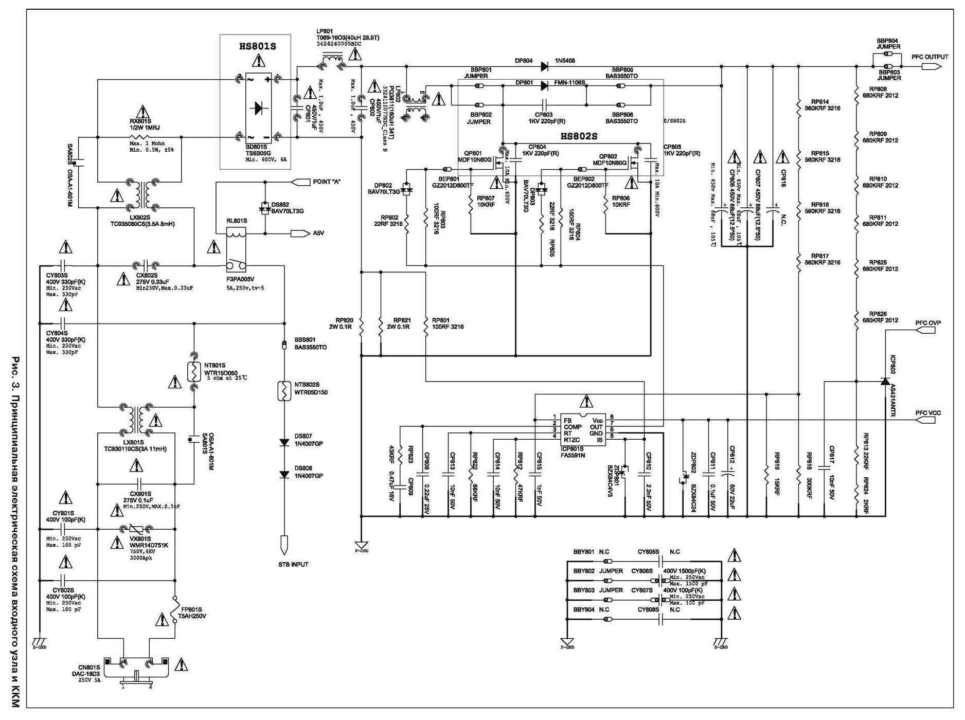 - Корректор коэффициента мощности. На работу остальных блоков не влияет, БП может успешно работать и без него. Но выпрямители с фильтрами, коих в схема блока питания телевизора достаточно, отличаются резко несинусоидальной формой тока. Это приводит к появлению в токе потребления гармоник, создающих помехи в питающей сети, а также к повышению бесполезно потребляемого реактивного тока, что требует увеличения сечения проводников. Для борьбы с этими явлениями и служит ККМ, корректирующий соотношение активной и реактивной составляющей тока.