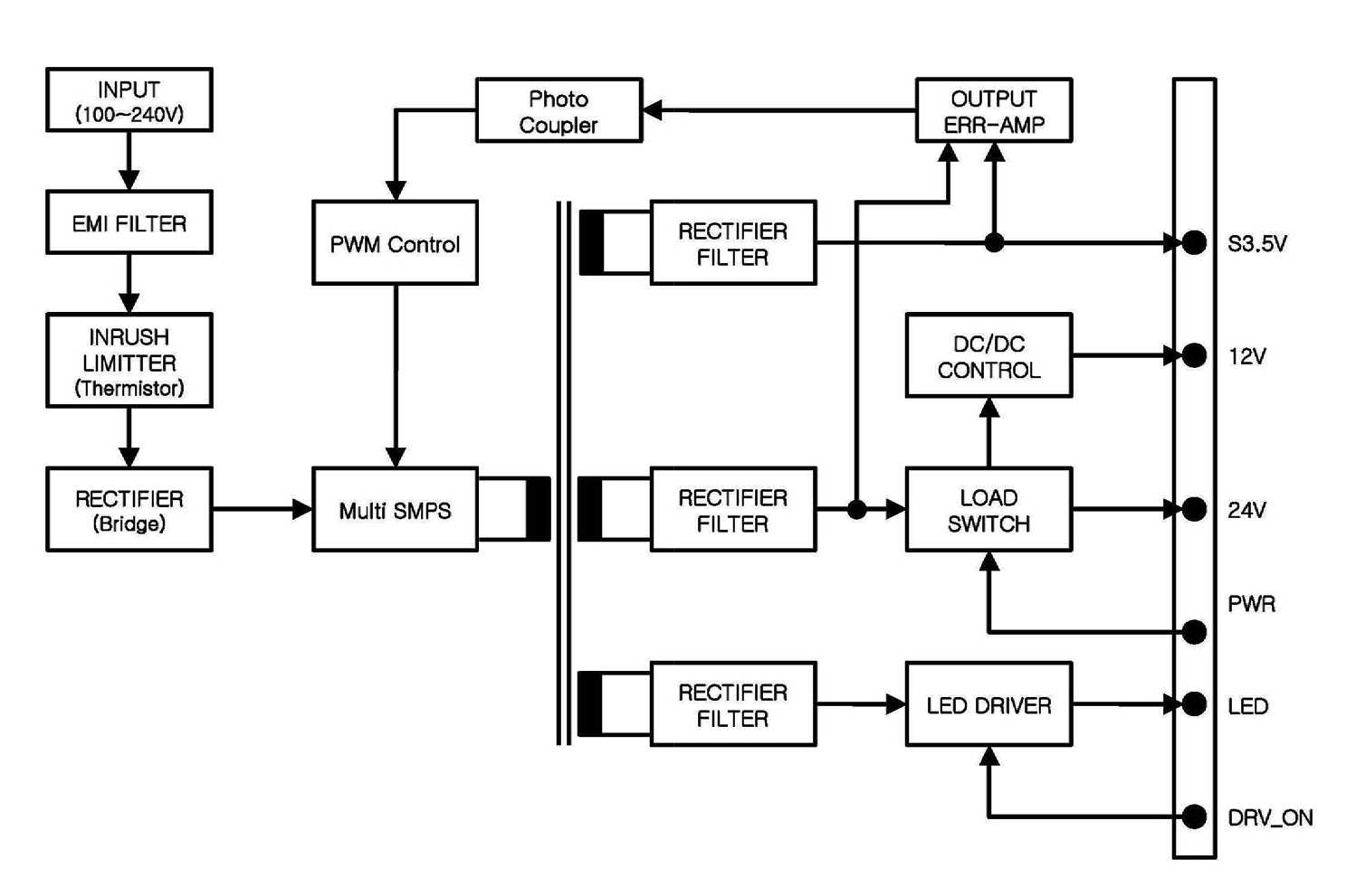 Конкретную схему можно рассмотреть на примере БП производства SAMSUNG платы источника питания BN44-0042. Он построен по приведенной выше блок-схеме.