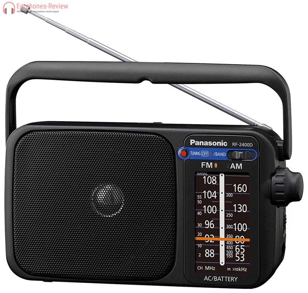ТОП-3 лучших радиоприемников открывает портативная модель RF-2400DEE-K. Устройство представлено в черном корпусе и оснащено складной ручкой для переноса. Радиоприемник можно подключить с помощью адаптера переменного тока к сети или использовать автономно, вставив 4 батарейки AA.