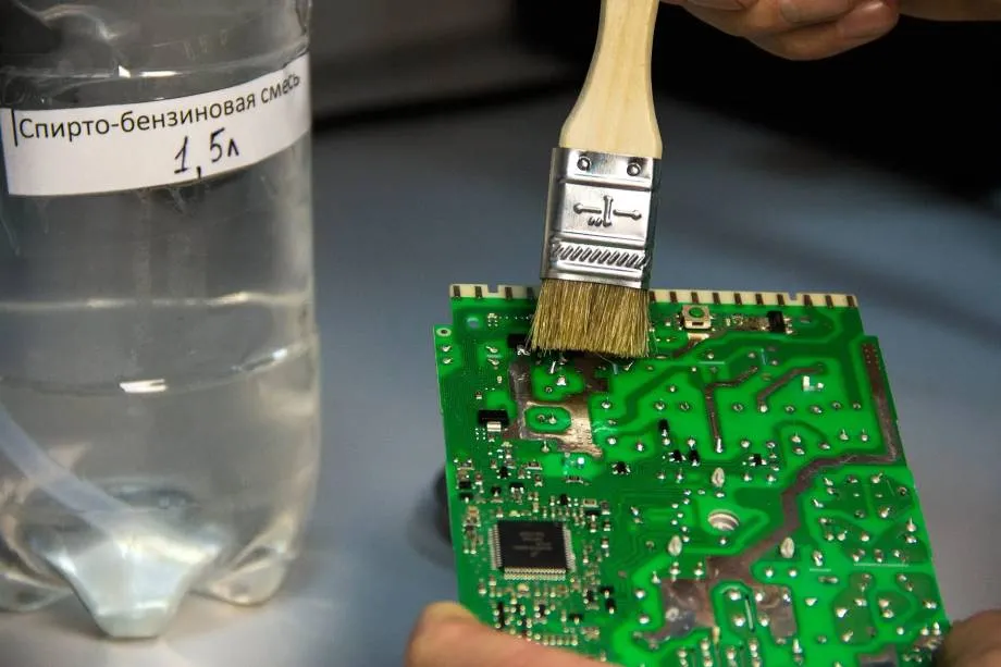 Речь идет о бензине «Калоша» («Галоша»). Это бензин-растворитель, который применяют в резиновой промышленности, для разбавления эмалей и красок, обезжиривания поверхностей перед склеиванием. Также он отлично справляется с удалением флюса, термопасты и грязи с плат. Достаточно нанести несколько капель на тряпку или щетку и прочистить место.