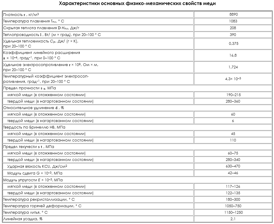 Медь обладает высокими значениями плотности, температуры плавления и температуры кипения. Важным свойством также является хорошая стойкость по отношению к коррозии. К примеру, при высокой влажности железо окисляется значительно быстрее.