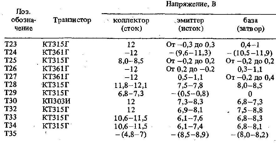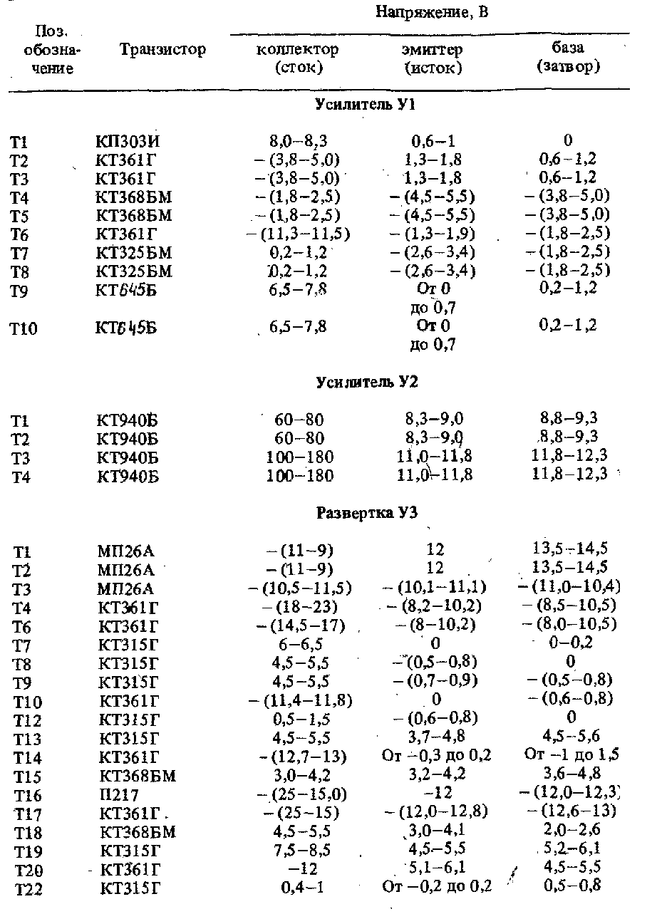 - развертка УЗ: резистором R8 (УРОВЕНЬ) потенциал базы транзистора УЗ-Т8 устанавливается О; переключателями УЗ-В1-2, УЗ-В1-З, УЗ-В1-4 устанавливаются в положения ВНУТР, JL, ЖДУЩ соответственно, резистором R20 луч устанавливается в центре экрана; переключатели V/ДЕЛ и ВРЕМЯ/ДЕЛ находятся в положениях „05” и „2” соответственно; напряжение на электродах транзистора УЗ-Т7 снимается в положении* переключателя V/ДЕЛ; напряжения иа электродах транзисторов УЗ-Т4, УЗ-Т6 проверяются относительно общей точки диодов УЗ-Д2 и УЗ-Д3, при этом переключатель УЗ-В1-4 устанавливается в положение АВТ; питающие напряжения 12 и минус 12 В должны быть установлены с точностью ± 0,1 В, при напряжении сети 220 ± 4 В.