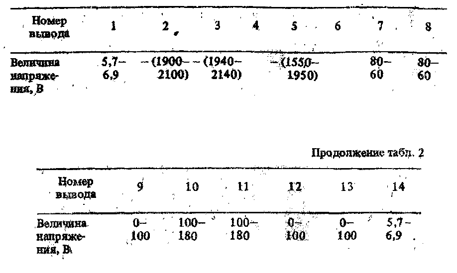 Проверка режимов, приведенных в таблице 2 (кроме особо оговоренных) , производится относительно корпуса прибора. Проверка режима на контактах 1, 14 ЭЛТ (Л2) производится, относительно потенциалакатода(минус 2000 В). Режимы работа могут отличаться от указанных с табл. 1, 2 на ±20%.
