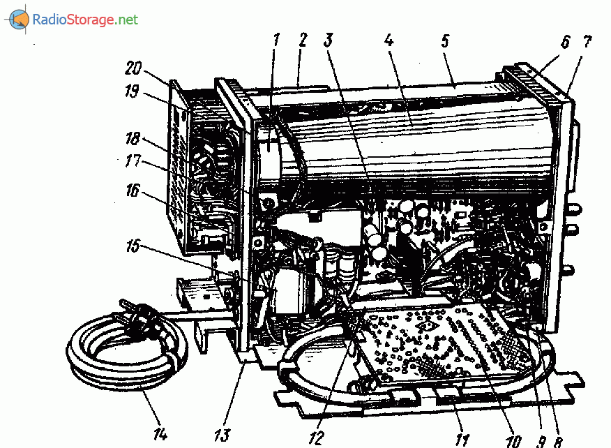 1 — скоба; 2 — крышка; 3 — развертка; 4 — экран; 5 — верхняя планка; 6 -винт; 7 — передняя панель; 8 — подставка; 9 — передняя ножка; 10 — усилитель; 11 — линия задержки; 12 — нижняя планка; 13 — задняя ножка; 14 -шнур питания; 15 — силовой трансформатор; 16 — усилитель; 17 — панель ЭЛТ; 18 — винт; 19 — крышка; 20 — задняя стенка.