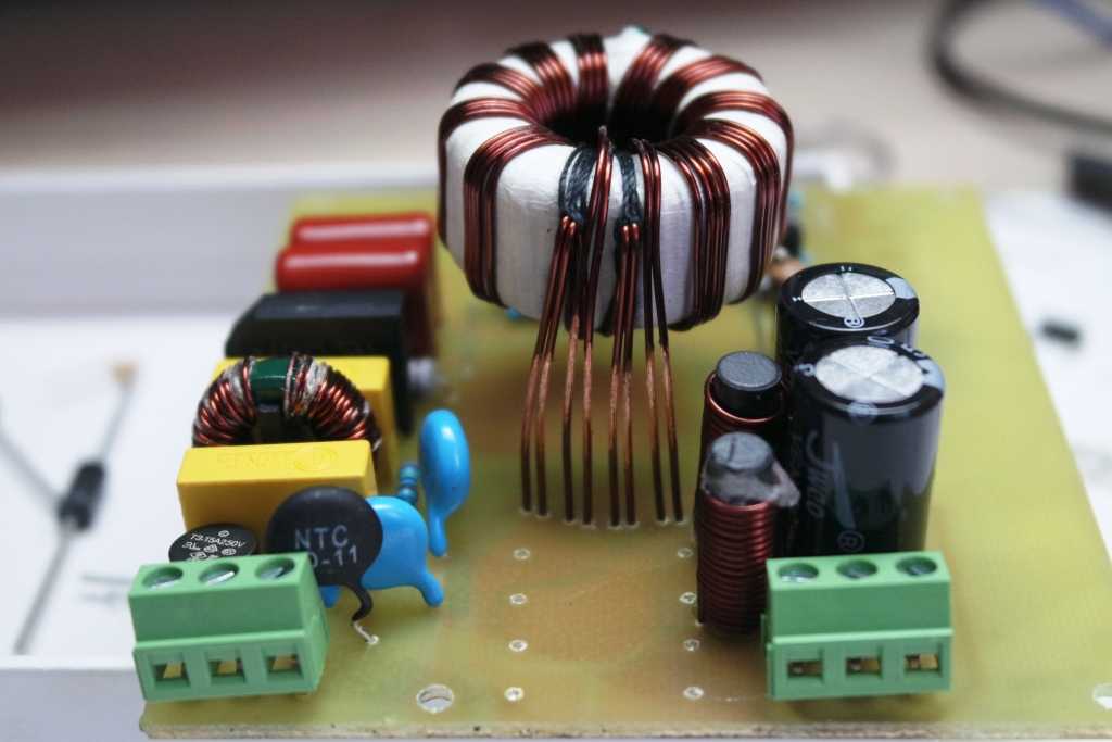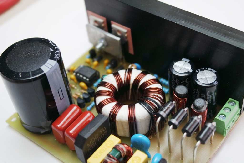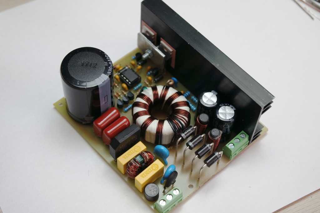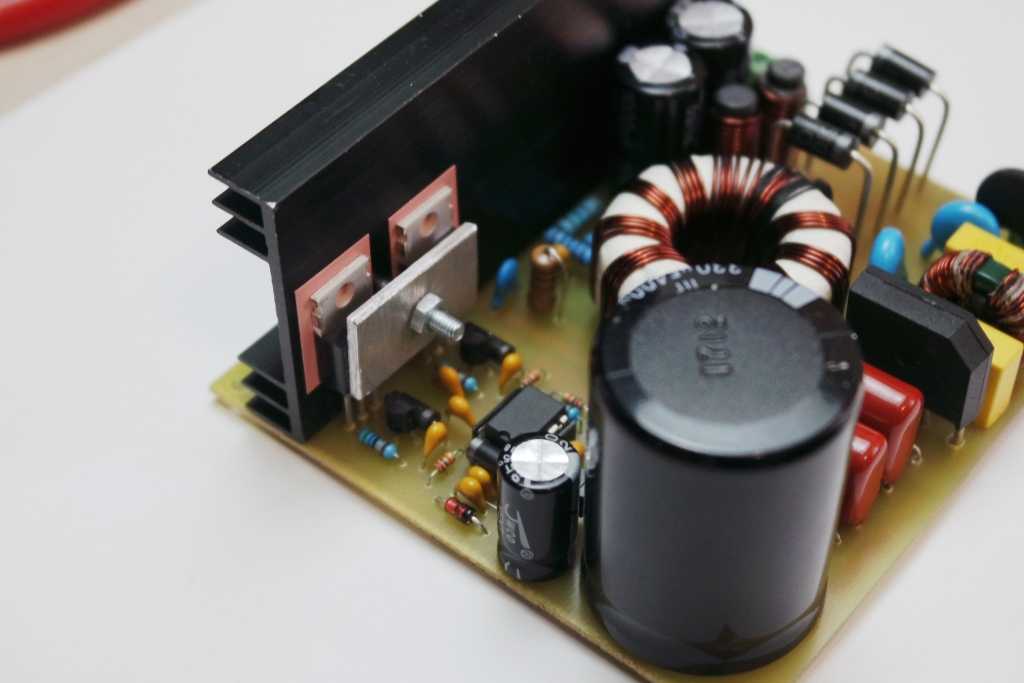Пара конденсаторов на входе берется из расчета 1 мкф на 1 Вт. В нашем случае конденсаторы “вытянут” нагрузку в 220Вт.
