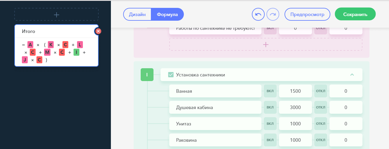 Как видите, сервис также подходит для создания форм заказа, отзывов, обратной связи и так далее. Чтобы превратить калькулятор в обычную форму, достаточно удалить значок формулы (на картинке слева) во вкладке “Формула” в редакторе uCalc.