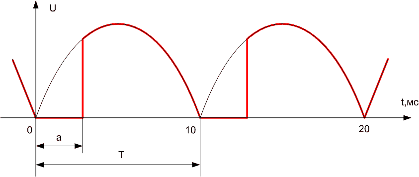 Таким образом, задерживая импульс запуска, подаваемый на клемму затвора тиристоров, на контролируемый период времени или угол ( α ) после того, как напряжение питания переменного тока прошло пересечение нулевого напряжения между анодным и катодным напряжением, мы можем контролировать, когда тиристор начинает проводить ток и, следовательно, контролировать среднее выходное напряжение.
