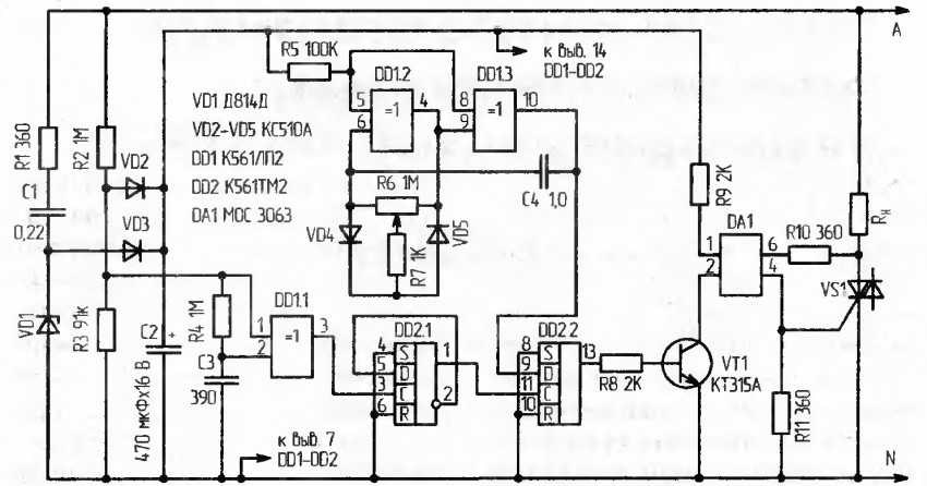 По R2 и R3 протекает ток, который накапливает заряд на конденсаторе С1. После того, как на заряд достигнет значения 32 В, откроется динистор VD3 и конденсатор С1 начнет разряжаться через R4 и VD3. Энергия пойдет на симистор VD4, он откроется и даст току протекать через нагрузку.