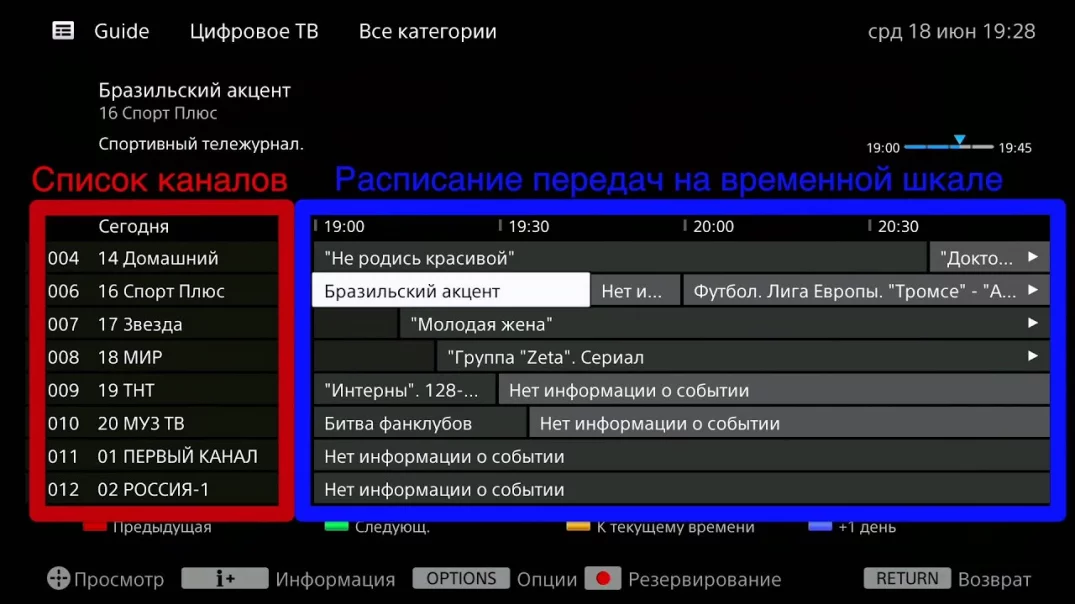 Телегид — это удобная программа телевидения на 8 дней. Вызывается этот помощник нажатием кнопки GUIDE на пульте ДУ.