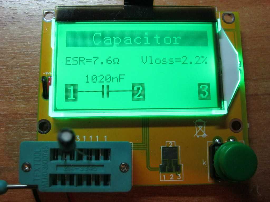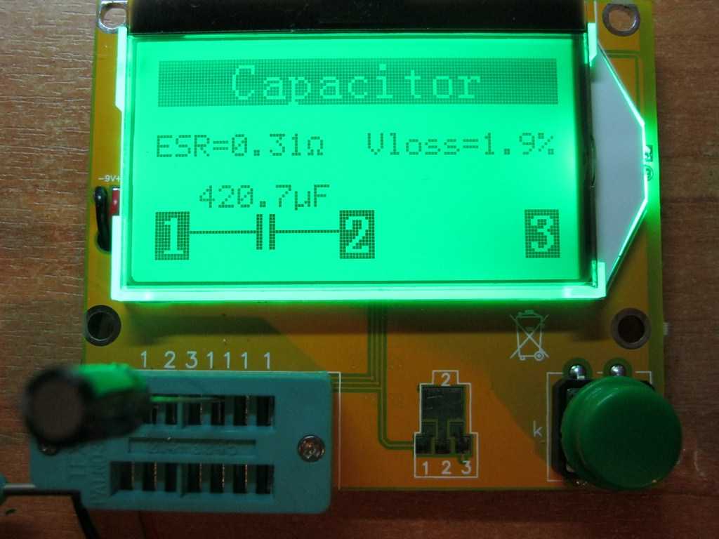 Вместо привычной ZIF-панели, которой оснащаются другие модели тестеров, тут предусмотрены специальные контакты и выводы под стандартные щупы мультиметра, а кроме того есть отдельные площадки для тестирования SMD-компонентов и разряда конденсаторов. Специально для такого случая оставил оставил тот мелкий конденсатор из дежурки блока питания, чтобы показать наглядно завышенный ESR (табличка для определения допустимых значений ESR есть на задней панели корпуса тестера).