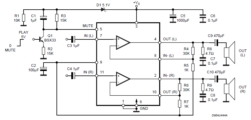 Если на выводе 5 присутствует напряжение менее +Vs-6В (менее +14В), то усилитель войдет в режим воспроизведения звукового сигнала.