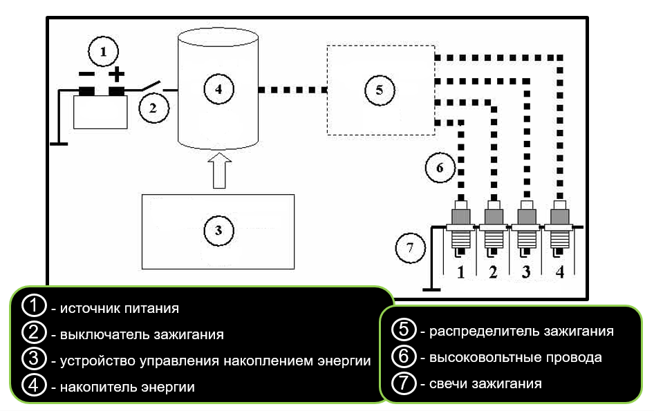 Работа системы зажигания основана на следующем принципе: при подаче в сеть низковольтного напряжения, происходит накопление и преобразование энергии, что затем распределяется по свечам, на электродах которых формируется искра, провоцирующая воспламенение топливовоздушной смеси.