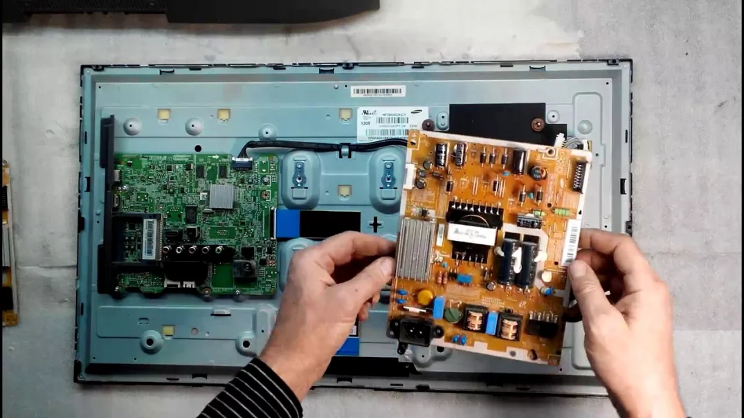 В зависимости от модели и поколения телевизора, блок питания может быть расположен по-разному. В любом случае, необходимо будет снять с ТВ заднюю крышку, которая крепится по периметру небольшими болтиками. После снятия крышки, плата БК будет заметна – она может быть либо оголена, либо скрываться за дополнительным защитным кожухом. Проще всего определить местоположение блока питания по входящему разъему питания, где подход кабель с сети – там и находится плата. Если БК закрыт защитой, ее также придется снять, выкручивая болтику по периметру кожуха. Оголив плату, ее можно будет снять. Сделать это можно следующим образом: