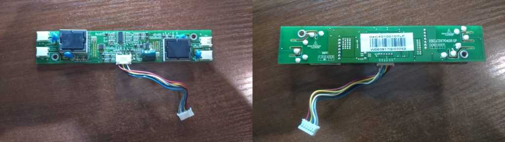 - Наш монитор имеет внешний блок питания и отдельную плату инвертора. В таком случае мы просто приобретаем новый инвертор или подходящий б/у и подключаем его к плате контроллера матрицы. Благо, в подавляющем большинстве случаев интерфейсы подключения инвертора универсальны.
